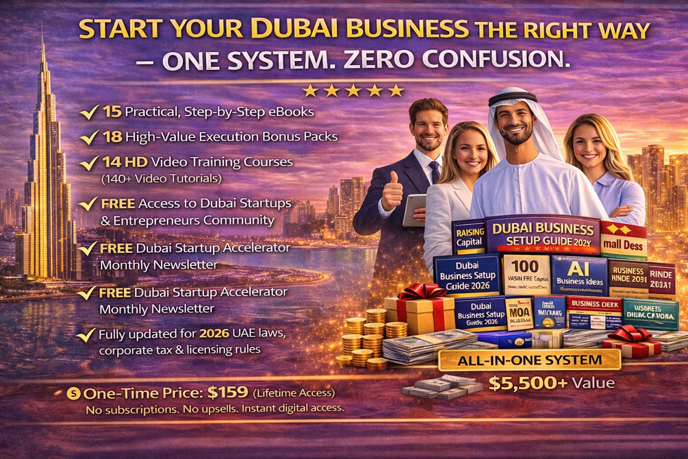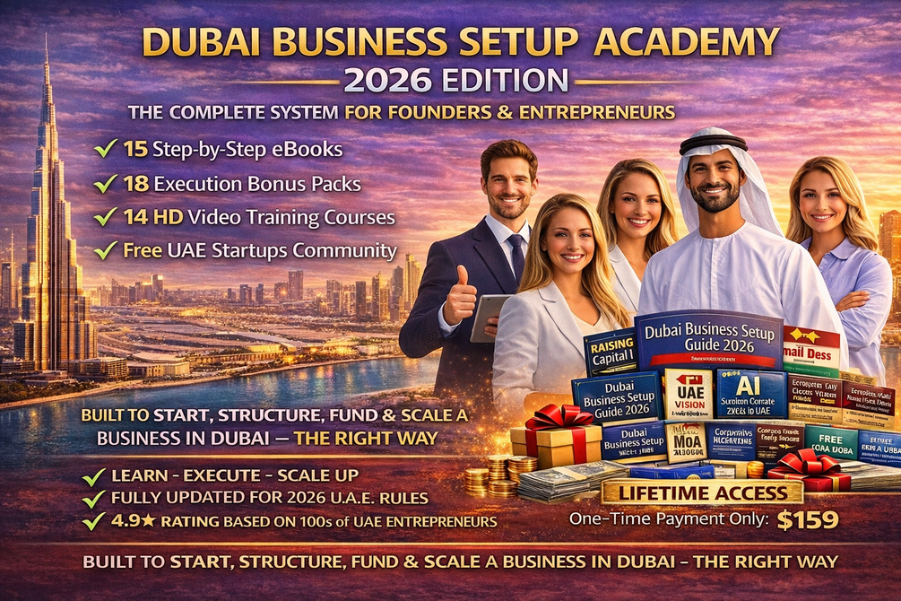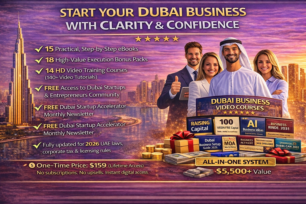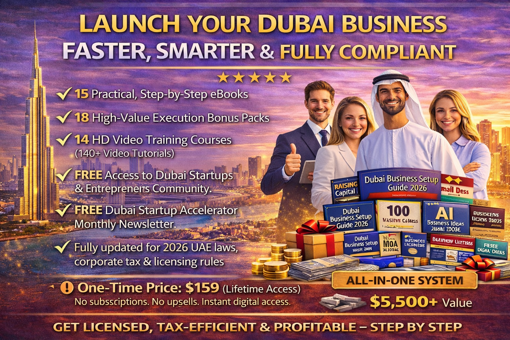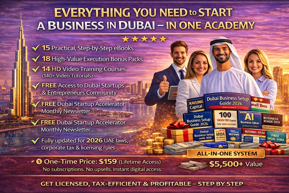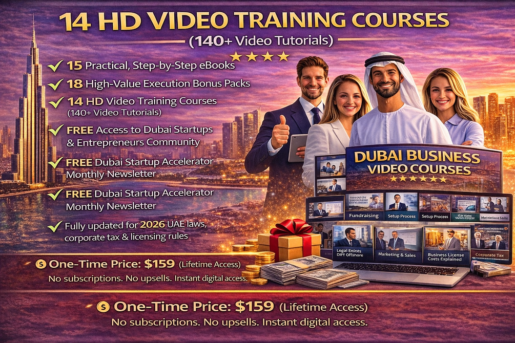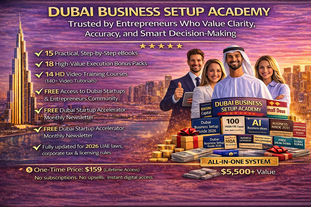 🎯 Dubai Business Setup Academy – 2026 Edition: Designed for Founders, Expats, Freelancers, and Entrepreneurs. This comprehensive Education and Execution System enables you to Start, Structure, Fund, and Scale a Business in Dubai and the UAE effectively - ✔ 15 Practical, Step-by-Step eBooks, ✔ 18 High-Value Execution Bonus Packs, ✔ 14 HD Video Training Courses (over 140 Video Tutorials), ✔ Complimentary Access to the Dubai Startups and Entrepreneurs Community, ✔ Complimentary Dubai Startup Accelerator Monthly Newsletter, and ✔ Fully updated to reflect the 2026 UAE laws, corporate tax, and licensing regulations. Available for a one-time fee of 💰 $159 (Lifetime Access). No subscriptions. No upsells. Instant digital access.